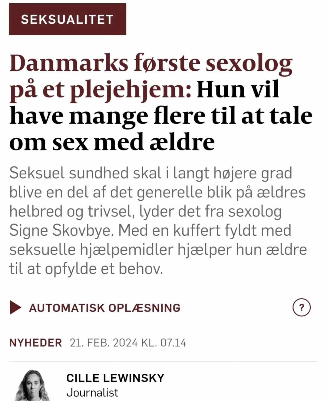 Signe Skovbye er uddannet klinisk sexolog hos DACS og har skrevet bachelor i psykomotorisk terapi hos KP. Hun har specialiseret sig i seksuel sundhed blandt ældre og arbjeder indefor ældreområdet, herunder plejehjemmet Slottet, hvor Signe har udviklet landets første hjælpemiddelskasse, med seksuelle hjælpemidler der er aldersrelevante og brugbare for folk uanset funktionsniveau.